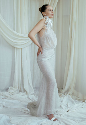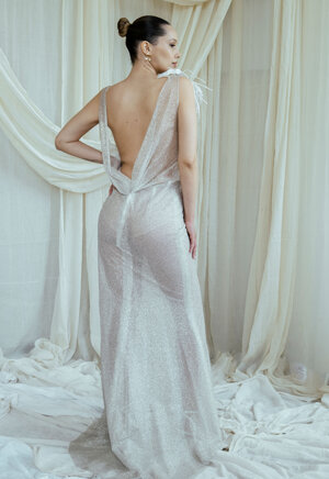 Abito in tulle glitter con schiena nuda totalmente sfoderato, con sottogonna in organza di seta.