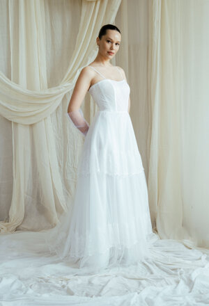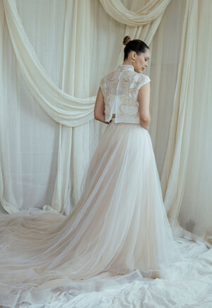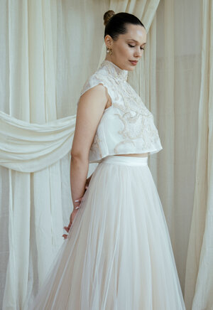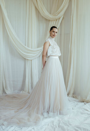 Abito composto da tre pezzi: top in cady di seta con scollo quadrato, top in organza di seta ricamato a mano e gonna composta da 7 strati di tulle di seta color nudo.