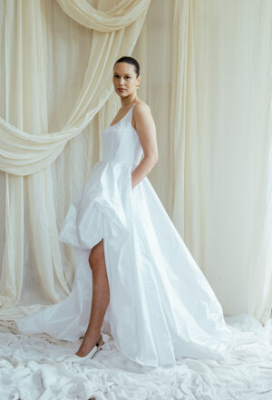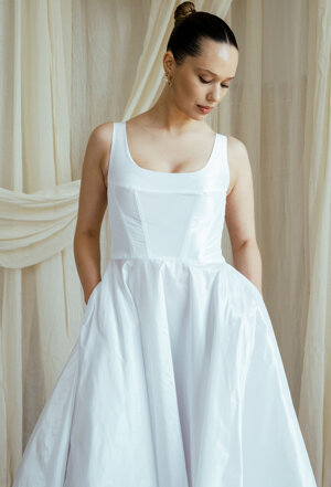 Abito bustier in taffetà, scollo quadrato, gonna ampia con possibilità di cambio look da gonna lunga a corta.