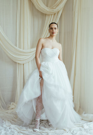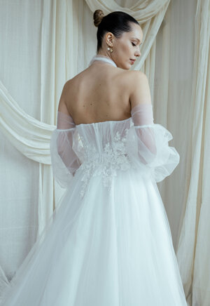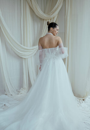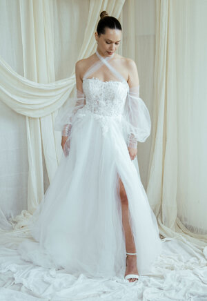 Abito con bustier steccato in pizzo con gonna in tulle e spacco alto. Maniche in organza da usare come accessorio.