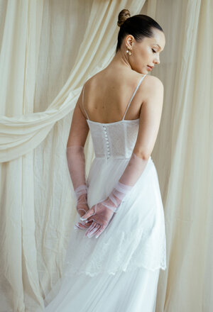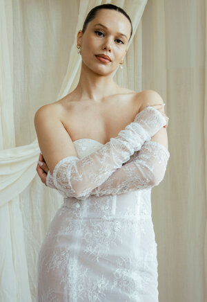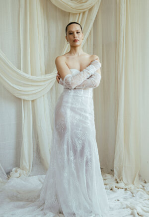 Abito a sirena in pizzo chantilly, sfoderato con ribattitura interna in chiffon di seta, ricamo di perline e fiori in madreperla. Guanti in pizzo chantilly con ricami come accessorio.