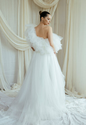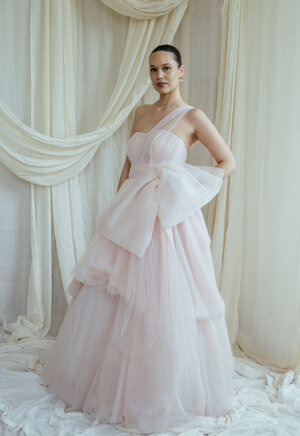 Abito con bustier in tulle di seta plissettato con monospalla, gonna a balze in tulle di seta tagliato a vivo, con maxi fiocco come accessorio.