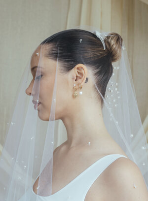 Velo con perle ricamate a mano e rouches in tulle di seta.