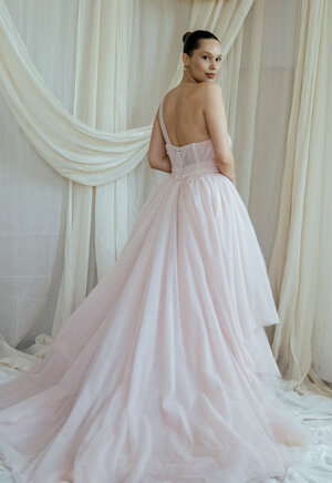 Abito in tulle plumetille color bocciolo con corpetto steccato, foulard e spille di rose nella stessa colorazione.